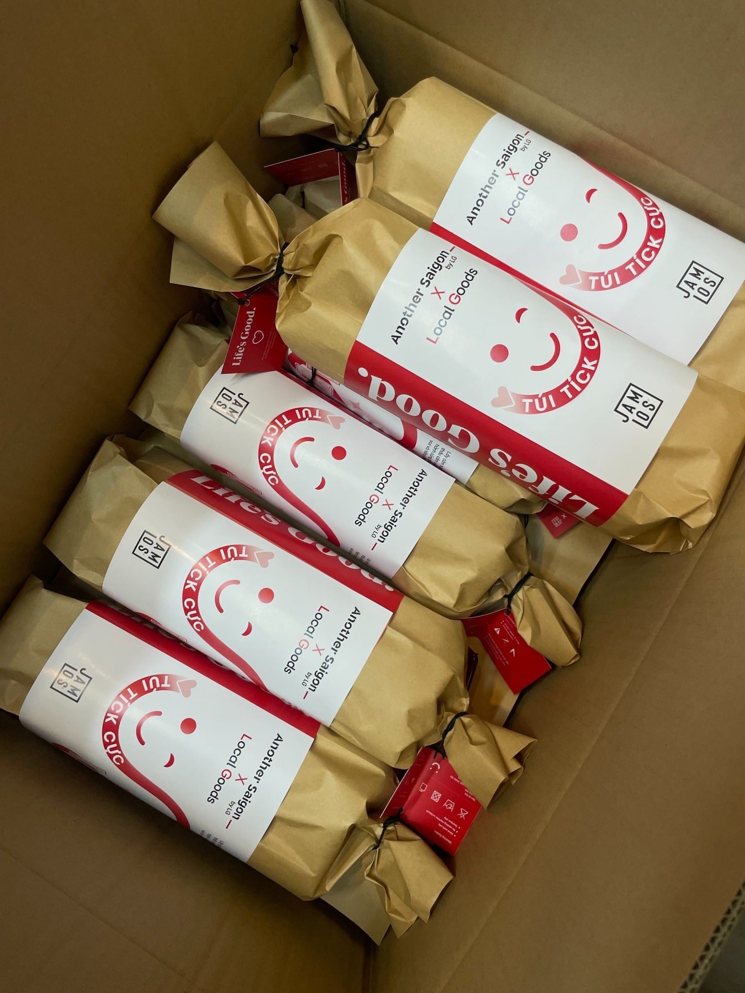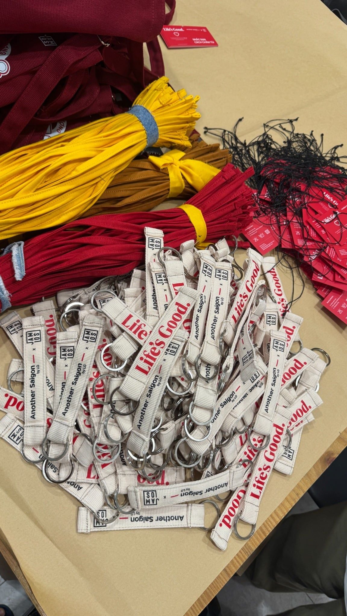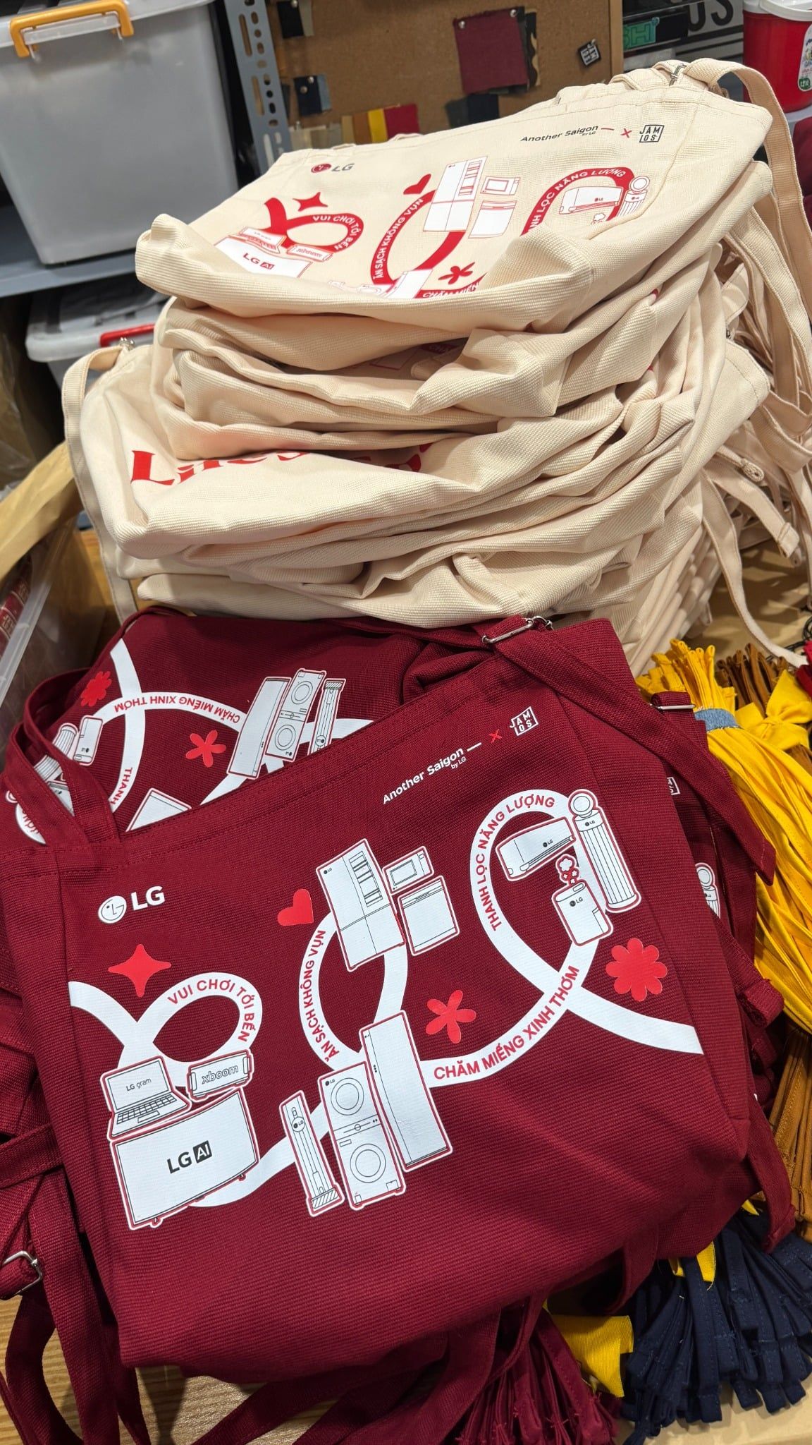 | Phương án | - Cross A Food is 2in1 bag with the adjustable straps for tote or crossbag. - Finalized 2 colors of the bag: Cream printing red content & Wine printing white content - Making the pins to interact and personalize on the bag: heart pin & Life's Good pin. When customers could pin anywhere in the artwork presenting the journey of the campaign. - DIY Workshop: the demo product of Jamlos launching soon in 2026, the DIY tie the canvas keychain charm with 2 combos of color and attaching with the canvas logo tag keychain. - Packaging: after packing the orginal papercraft of Jamlos, then wrapping the campaign print around the body of the paperbag to showcase the information & KV. - Customized the Jamlos Customer Note with LG red color & the message on the tag. |