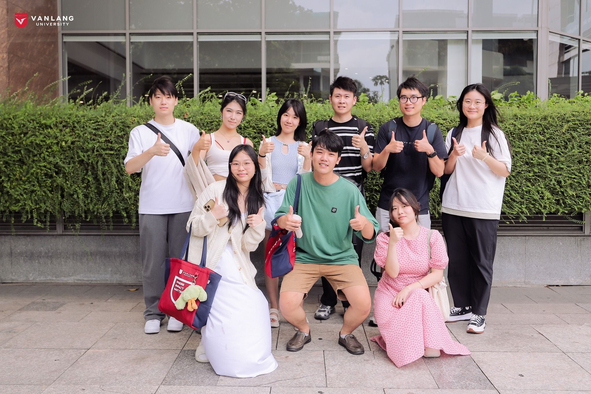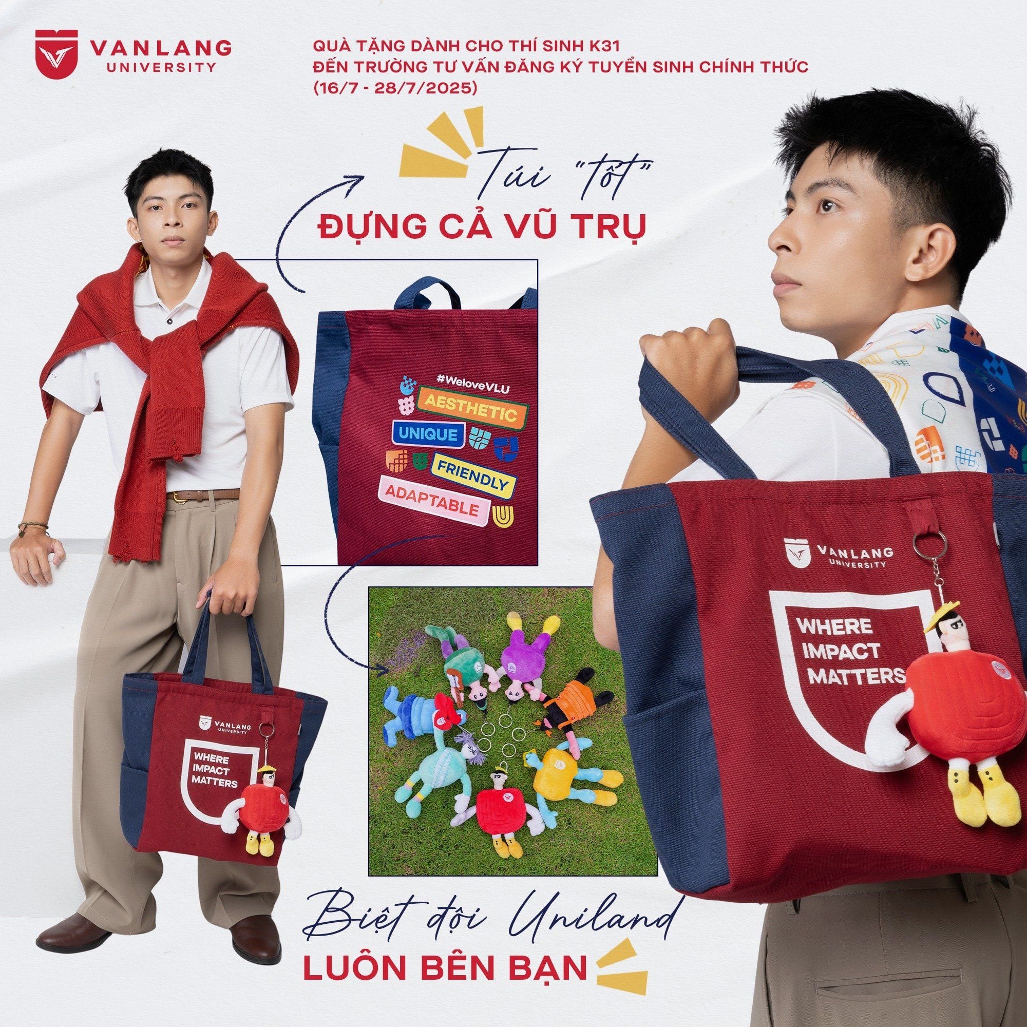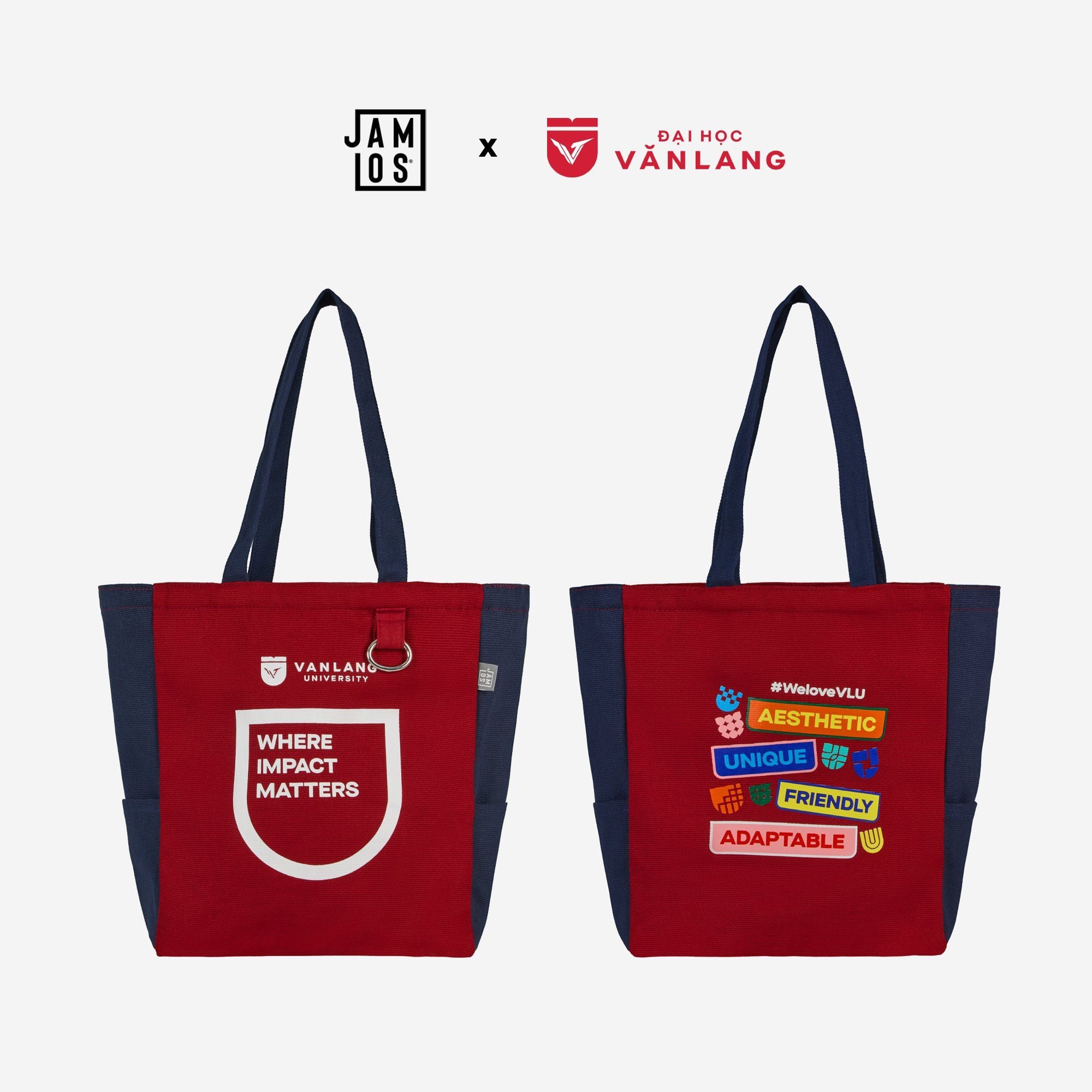 Sản phẩm sử dụng chất liệu canvas bền chắc với tông màu chủ đạo đỏ – xanh navy, đại diện cho màu nhận diện thương hiệu Văn Lang. Hai mặt túi được in lụa tinh xảo: một mặt thể hiện logo và thông điệp “Where Impact Matters”, mặt còn lại mang hashtag #WeLoveVLU cùng những từ khóa truyền cảm hứng.