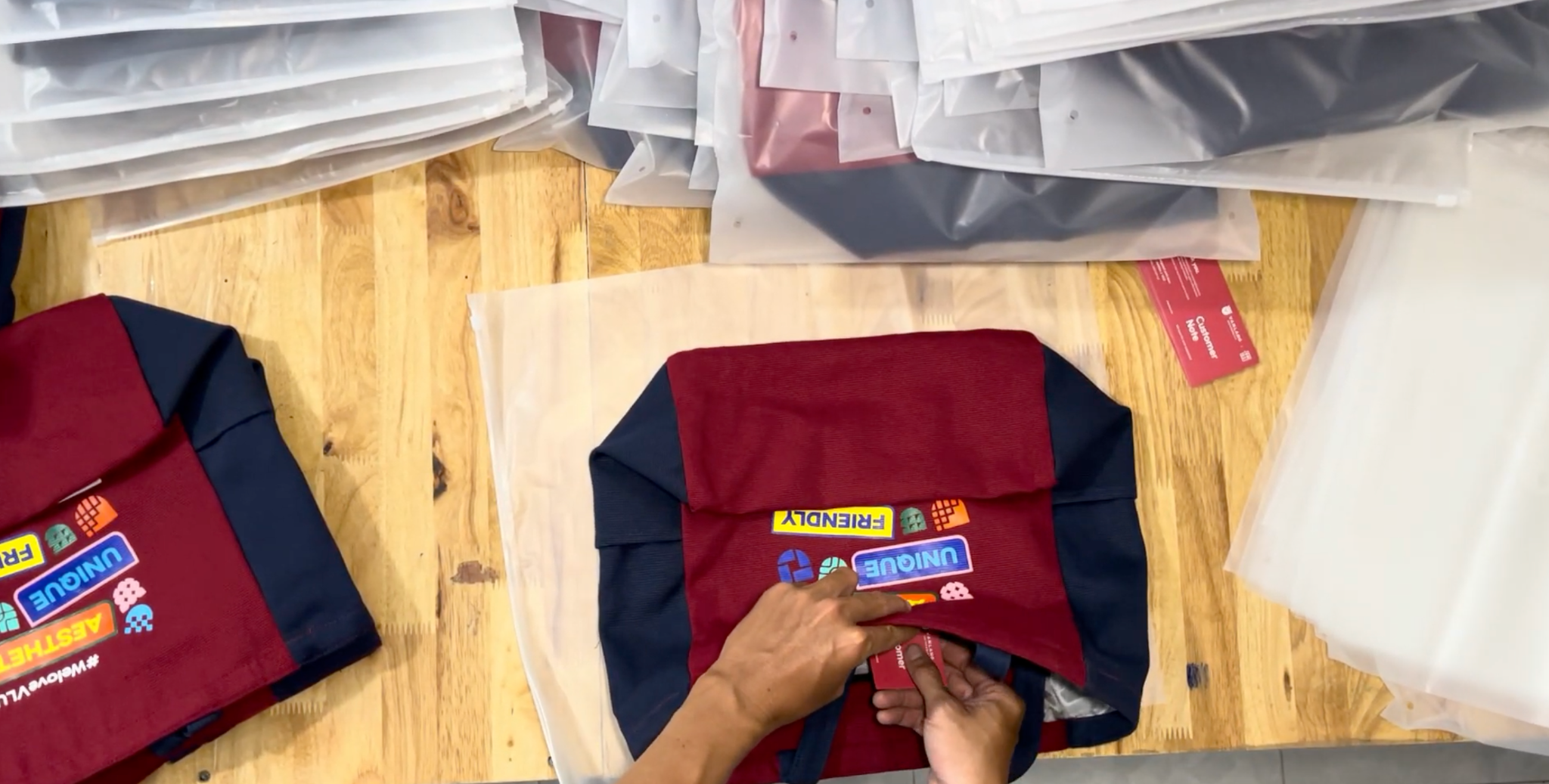 | Solution | - Saigon Hanoi Tote là dáng túi được ưa chuộng nhất năm 2025, và lần này một lần nữa được Văn Lang lựa chọn để thiết kế trên mẫu túi SGHN này. - Văn Lang với tỉ lệ đỏ nhiều hơn xanh, nên chọn màu đỏ làm thân chính túi cả 2 mặt, còn xanh làm 2 bên hông túi phối cùng với quai túi. - Hai túi nhỏ 2 bên hông túi cùng màu xanh với hông túi. - Jamlos R&D thêm móc vải ở cạnh phần quai túi, gần miệng túi, để móc charm vào. Jamlos không sử dụng D kim loại để hạn chế nhiều chi tiết và cần tập trung vào màu chủ đạo và hình in ấn nội dung túi hơn. - Hai mặt túi được in kỹ thuật in lụa, giúp màu trên túi được bền lâu và ít rủi ro bong tróc qua thời gian như các loại in decal nhanh gọn lẹ khác. - Logo Jamlos dùng phiên bản nhãn vải dệt màu xám may vào 1 bên mặt trước túi, để cùng co-branding với Văn Lang nhưng cũng cân đối layout logo Văn Lang in chính giữa mặt túi. - Túi được Jamlos bảo hành trọn đời, đi kèm với tag customer được Jamlos custom nội dung lời nhắn ở mặt sau cùng, thể hiện tinh thần của Văn Lang gửi đến các bạn tân sinh viên. |